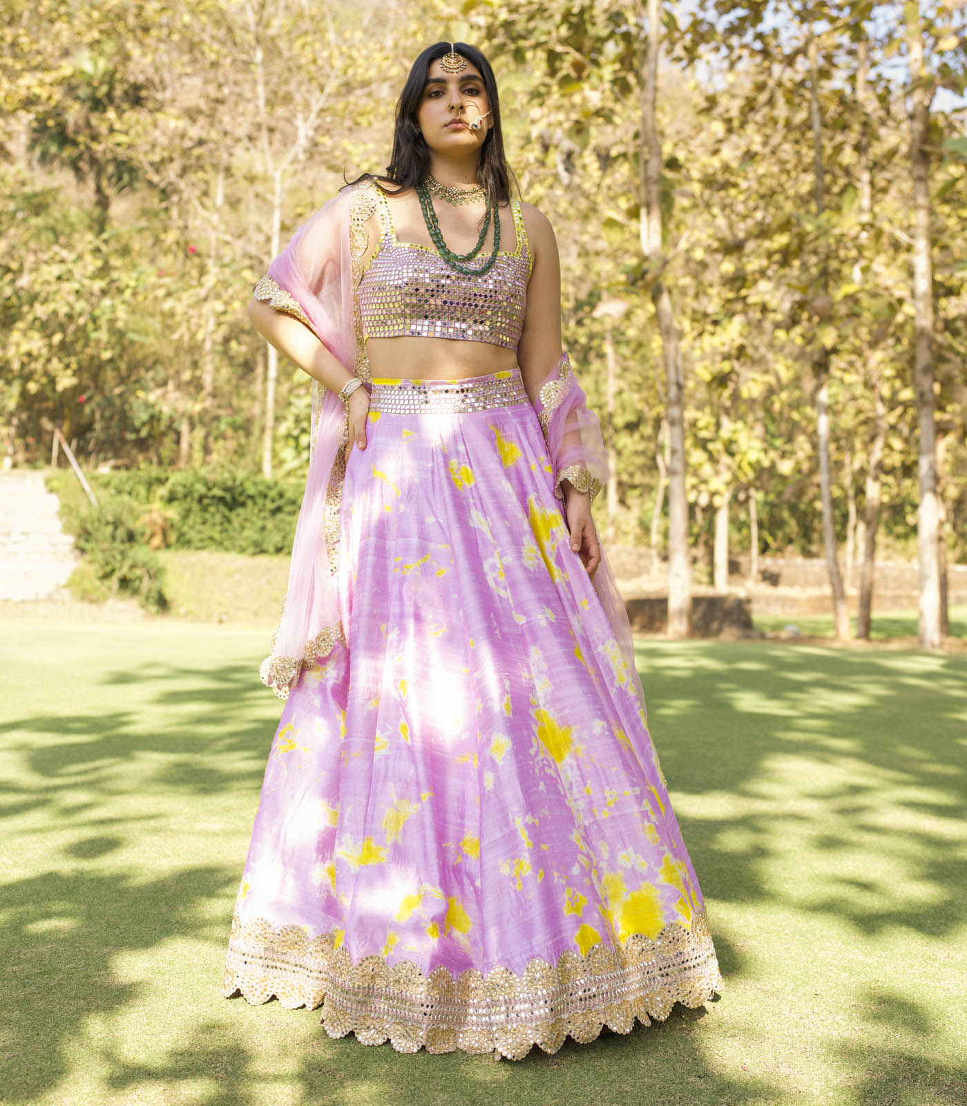 A lilac and yellow hand tie-dyed lehenga in raw silk base. It is paired with a blouse having mirror detailing and a net dupatta.